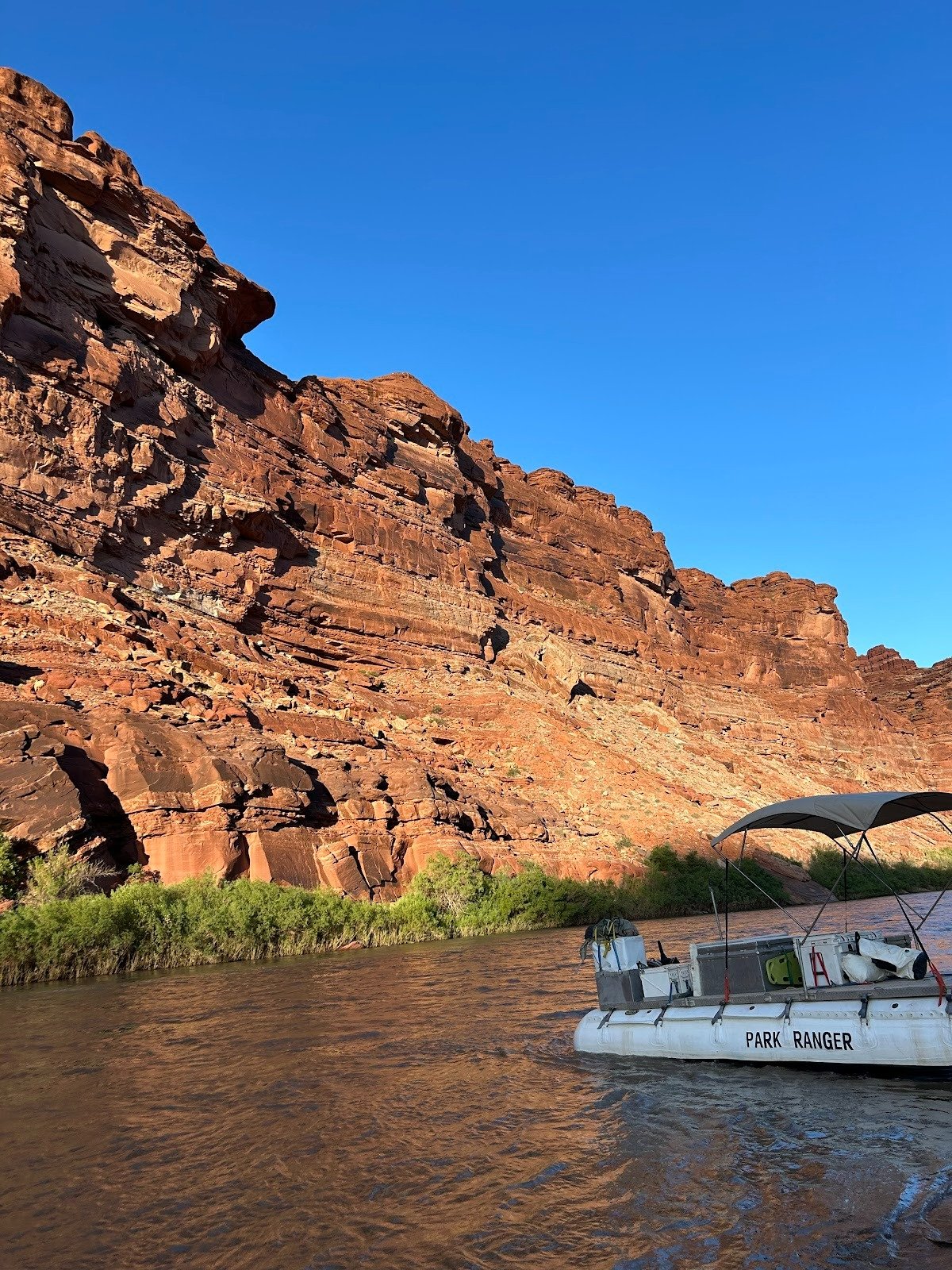 In his book Underland, Robert Macfarlane describes “thin places”. In thin places, time tosses away its orderly rules - the past and the present become less linear and more intertwined. The area around Canyonlands National Park is a thin place. I felt time get the thinnest on Day 2 of our monitoring trip down Cataract Canyon. We stopped the boat and hiked up to a spot where pictographs showed two handprints next to an old dwelling. One large handprint, one small. I thought of when I was nine years old, and my dad poured concrete for a walkway outside our house. We made two handprints- one large, one small. I stood in silence, near that beautiful riverbank, and thought of the family whose land I stood on.